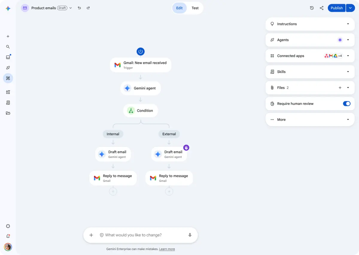 Google has also upgraded Agent Designer, which lets users create agents either with natural language instructions or through a visual workflow builder. The tool combines generative AI with deterministic steps so businesses can inspect, test and approve workflows before deployment.
